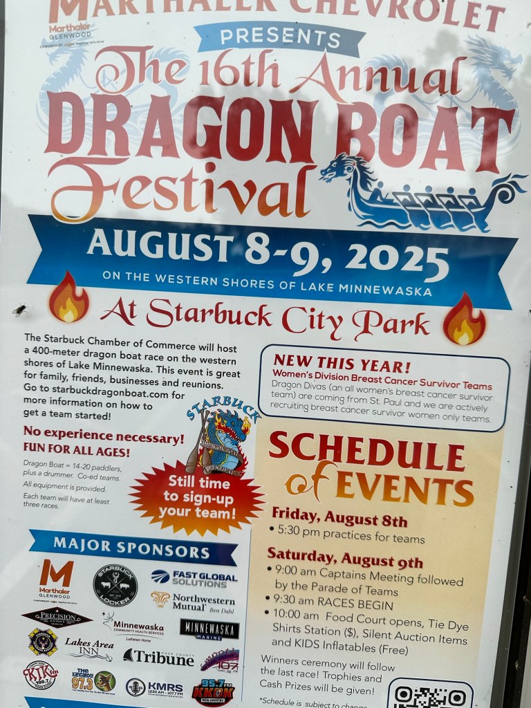 Dragonboat Festival * 400-meter dragon boat race on the shores of Lake Minnewaska. Teams of 14-20 compete against each other to raise money for their charity. There are food vendors and sponsors set up in tents in the city park. It’s a party. It’s a Viking thing. It was fun to hang with the community at the waters edge.