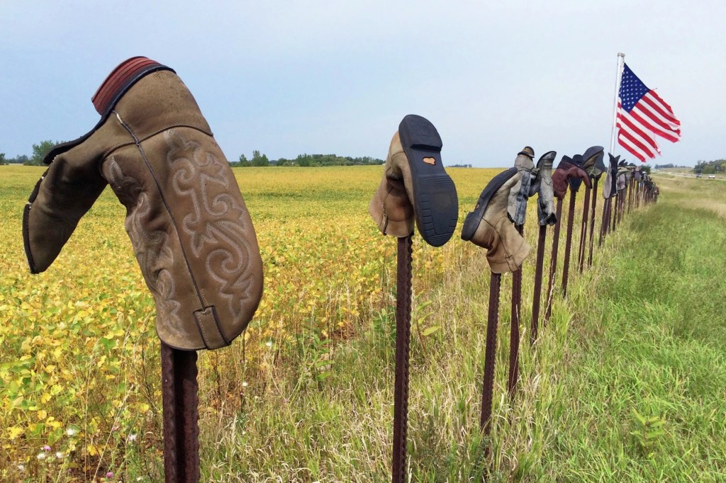 Boot Hill * There is a collection of nearly 70, mostly cowboy boots, on metal posts along Highway 29 between Glenwood and Starbuck, Minnesota. The display started with the Blair family; Ted Blair would post his worn out boots on the edge of his field. After he passed, the family added to it as well. It’s become a landmark to honor people who have passed. While it started with one family, it has since become a community effort with people contributing their own boots to the collection. One of those quickly landmarks you see while traveling the roads of America.